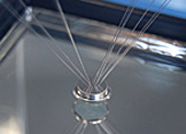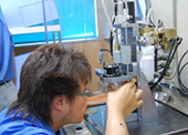 顧客からの高機能化の要求に応えて具現化したガソリンエンジン燃料噴射ノズル。中央に10数個の微細な孔が見える