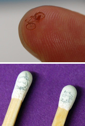 タカノのものづくりへの挑戦はまだまだ続く。自社で開発したレーザー加工装置で作成した、指先にのる自転車(上)と、マッチの先端に描かれたイラスト(下)マッチを発火させることなく、微細な作業が可能である。