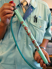 「これがMK精工の原点です」と笑顔で語る。1950年代に製造された灯油ポンプ。創業者である先代社長が、得意の金属加工技術に、特許を取得したアイデアをプラスして生み出した商品だ。「現在はプラスチック製ですが、開発当初はこのような金属製だったんですよ」