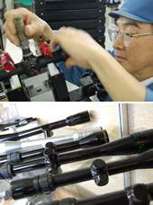 ライフルスコープがひとつひとつ仕上がっていく工場内部では、熟練の技術者が張り詰めた空気をかもし出す。「ミクロの製造技術」と「寸分の狂いもない組立技術」が両輪となって、高精度と耐久性を誇る製品が生まれる。
