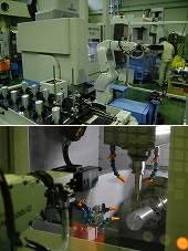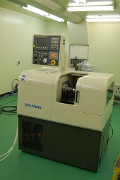 「微細精密複合加工」の代表選手は、精度と制御の技術を結集した「100-Nano」。その名前が示すとおり、誤差をナノメートル=1億分の1メートルの単位に収めて、金属を削り上げていくマシンだ。限りなく高い精度を実現するためには、小さなほこりやゴミを排除するのはもちろん、温度管理まで必要だ。完成品の試運転も、温度管理されたクリーンルームで行われていた。