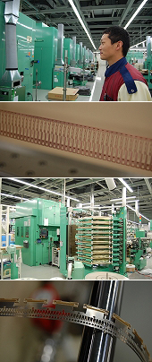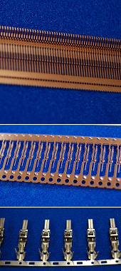 テープのように見えるのは、主に銅を原料とする厚さ0.1mmほどの金属材で、コネクターの材料となる。この薄い金属の板を、正確に切り抜き、折り曲げながら、微細な電子部品を作り上げていく。