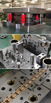 金型には500から600のパーツが組み込まれる。ここで、切り、抜き、曲げの加工が行われる。