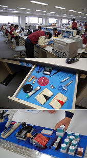 生産性向上への挑戦は、工場内に止まらない。事務部門のデスクには、余計なものが一切ない。パソコンのキーボードからハサミやノリ、ボールペンに至るまで、すべて置く場所が決まっている。
