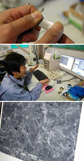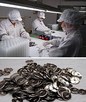 メッキ処理の後は、社員の目による検査が行われる(上)。ボタンのようにみえるのはハードディスクに使われるカバー(下)