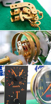 消防車のポンプに組み込まれる圧力計。国内のほぼ100%の消防車に、長野県・諏訪で作られた技術が生かされている。
