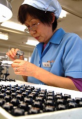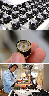 「ここで働いてもらっている女性たち、とても優秀なんです」と、高橋社長。パチンコ玉ほどの金属ボールの上に丸いプラスチック板を置き、その傾きで揺れを感知する感震センサー。人の命にかかわる製品だけに、組立から検査まで、いっときも気が抜けない。この作業を担うのが、約20人の女性社員たちだ。