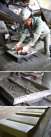 軽く水分を含んだ灰色の砂を、型に盛り込んでいく。砂のように見えるのは、極限まで水分を減らしたセメント。さらさらとした印象だ。しかし専用の機械で上部から圧力をかけながら激しい振動を与えることおよそ3分。砂のように見えたセメントは、しっかりとコンクリートの塊となった。手際よく作業が進められるが、水分量から振動の与え方まで熟練技術を要する。アスザックは日本で最も古くからバイコン製品を製造している。
