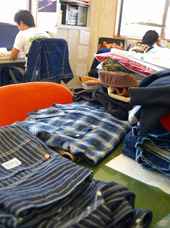 素材選びから、デザイン、ミーティングの他、ジーンズの修理も千曲市の事務所内で行われる。印象的だったのは、手仕事の現場を支える若いスタッフたち。