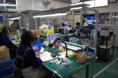 全国トップクラスの販売個数を誇る自社ブランドの自動水栓だが、工場内に専用ラインはない。従業員たちは各人の机で、最終製品の組み立てやチェックをおこなっている。