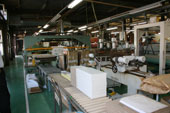 家具づくりといえば木の香が漂う作業場で、鑿(のみ)と鉋(かんな)が並んでいて、というイメージがある。しかし、イイダアックスの工場は、コンピューターによる自動制御の機器が並ぶ。加えて、製品によって組み替えたり、機器の部品を入れ替えたりできる生産ラインだ。その設備は、遠赤外線乾燥機、大型高周波接着機、材料のボードをカットするドイツ製のランニングソーまである。このランニングソーは、開口部が3メートルもあり、分速100メートルのまさに走るのこぎり。どうしても必要だと判断し、社長自らドイツまで出かけて購入したものだ。