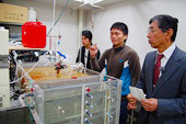 「100分の1スケールでの実験です」信大工学部土木工学科の研究棟1階には、1m四方もある大型水槽。藤縄研究室4年の大山辰則君が説明を続けます。
