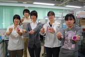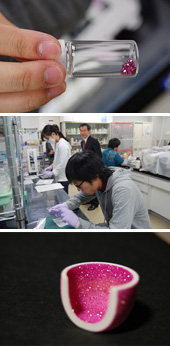 「美しい宝石、私たちがつくりました!」 研究室の学生たちが手にするのは、紛れもない本物のルビー。 信州大学では、高品質な天然ルビーの結晶のひとつ「六方両錐(ろっぽうりょうすい)」を、世界で初めて人工的につくることに成功しました。