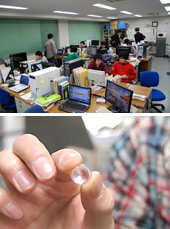 イメージしにくいガラスレンズの研究ですが、基本はガラスの特性を数値化して、そのデータをもとにパソコンで解析していく...という工程。研究で得られた結果は、企業内での実際のガラスレンズ製造に活かされています。