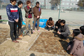 2m四方に区切られた4つの枠は、それぞれ「普通のアスファルト」「水を通すアスファルト」「栗の木舗装(下がコンクリート)」「栗の木舗装(下が砂地)」。学生たちが自らつくった様々な舗装面です。