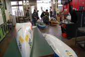 「素材にFRPというガラス繊維を使っています。とにかく軽くすることが目標です。」環境都市工学科4年清水智彦さんが取り組むのは、クルマのボディーづくり。設計図通りに削りながら型をつくり、その型にガラス繊維を敷き、上からプラスチックを塗って固めると繊維強化プラスチックのボディーが完成します。