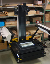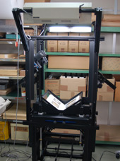 医療用撮影装置のノウハウを生かして開発されたのが、このV字型の書籍撮影装置。絶版になった本や古書などを撮影するものだ。V字型にして撮影することで、本を傷めることなく均一にページを撮影することを可能にした。国内でこのタイプの撮影装置を製造しているのは杉浦研究所だけで、まさに「オンリーワン」の製品だ。