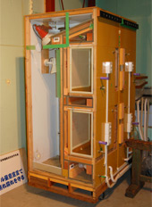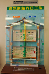2006年に本社を現在地に移転した際に、隣接して建てられたのがこの「ワンダーベース」。WB工法と気密性の高い住まいを比較する体感施設で、大きな建物の中に実際の建築家屋がすっぽり入っている。高い温度や湿度に設定した状態で、家屋にどのような違いが出てくるかを来場者に体験してもらっているという、まさに巨大な実験棟だ。一般の方から住宅建築の専門家まで、全国からの見学者を受け入れている。