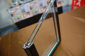 「苦労しました。ホームセンターで資材を買ってきて、試作品をつくりました。それをガラスメーカーに持って行っても『こんなの売れっこない』と相手にしてくれない。それでも『自分たちで売るから』と頼み込んだ」と近江社長。6年がかりで商品化したのが「厚くても取り付けやすい」あんみつガラスだった。