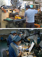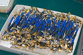 同軸コネクタの部品は松本工場で製造され、麻績工場に運ばれ手作業で組み立てられた後検査を経て出荷される。この工程で活躍するのが、熟練した技能を持つ女性スタッフたち。100分の数ミリで位置決めを行う微細な半田付け作業も、黙々と入念に仕上げていく。多品種少ロットに対応するために治工具もオリジナルで作成するなど、長年の経験に基づいた高い技術力が高性能の製品開発を支えている。