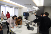 「これを叩くことによっておもちゃの飛行船をいろんな方向に動かすことができます。情報通信の仕組みが理解できます」と、情報工学科4年の箕浦航さん。仕掛けは、スプーンの音をキャッチするマイクにあります。コンピューターなど「デジタル」というのは、1とゼロの2つの信号の組み合わせで、いろいろな指令を出しています。このスプーンも、1=「たたく」ゼロ=「たたかない」というふたつの信号を組み合わせることで、前・後・上・下・右・左などの命令に変換し、飛行船をコントロールしています。