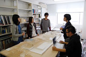 建築関連雑誌に掲載された言葉をピックアップし掲載頻度と関連の強さをまとめたり、研究室で設計競技に参加したりと、先生と学生たちがひとつのチームとして活動している信大工学部寺内研。「もともと建築には女性が多い」と笑顔をみせる先生本人はじめ、理系女子たちが積極的に研究に取り組む姿が印象的でした。