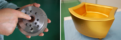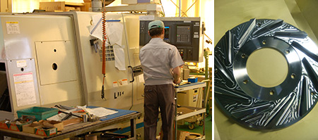 この部品は、IHIのコンプレッサーに使用されている軸受。いくつもの部品を組み合わせて作られていて、完成した際は10ミクロン以内の公差に管理されている。これ以外にも機械による加工が難しいとされるこのような5軸製品も、共栄製作所だから出来るものだという。取材した駒沢工場をはじめ、グループの企業・工場それぞれが得意とする特殊技術を有している。(5軸とは、5軸加工機をあらわし、X、Y、Z軸移動の3軸加工機に回転軸を2軸付加して、同時制御出来る機械。)