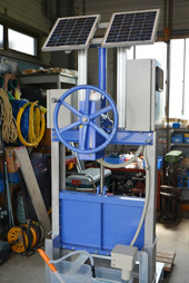 最大の特徴は、電源供給装置。設置されたソーラーパネルによって発電し充電されるため、外部電源の供給が要らないうえに非常時の電源喪失の危険性も少ない。蓄電池も二輪車などに使用される24Vの小型タイプ。最も苦労したのが、省電力で大きな水門を動かす装置を作ること。相談に訪れた団体では「実現不可能」とまで言われたが、スタッフの努力と工夫によって何とか実現に漕ぎ着けた。