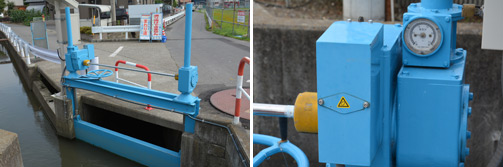 一見すると、普通のものと同じに見えるこの水門。実は昨年特許を取得した自動開閉装置の付いたものだ。後付で設置出来るため、外見上は通常のものとの違いが分かりづらいが、このBOXの中に創意と工夫を凝らした装置が詰め込まれている。開発したのは、長野市にある伊東産業長野支社だ。