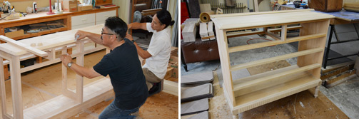 「長年培ったクラシックのディテールを加味しながらお客さんが要望する家具やキッチンを作っています」と語る、社長の小野寺俊一さん。小野寺さんはギター製造会社に勤務していた頃から、素材としての木の素晴らしさを実感していた。その後水道設備工事の仕事を経て、1997年にデラ工房を創設。水道工事の経験を生かしたオーダーキッチンを手始めに、オリジナル家具やリフォームへとその領域を広げていった。