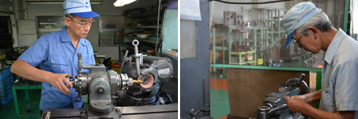 金属部品の加工に使われる切削工具。山岸製作所では、これらの工具のほとんどを自社で製作している。熟練工が加工場で、ひとつひとつ手作業で丁寧に作り上げていく。このようなベテラン技能者を定年以降も希望があれば雇用していて、その技術が製品の随所に活かされている。多品種少ロットに対応するために工具の種類も多岐に渡っていて、周辺の企業からの依頼で工具を製作することも多いという。