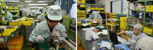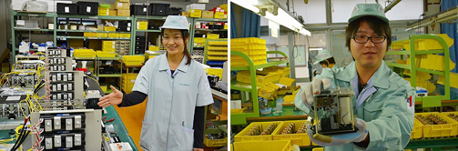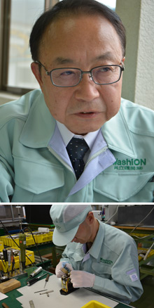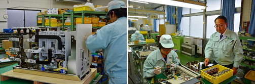 「150人の従業員、全員が正社員」と、追分社長。高い技術をもつ社員だからこそ多品種少量の製品ひとつひとつ、信頼の品質を維持することが可能だ。「接触する部分をしっかり組み立て、チェックをするには熟練の技が必要。電気を切る、という仕組みは単純だからこそ、一つ一つ人手がかかる作業です」