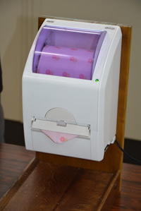 この世界最速試作センターが開発したのが、この自動三角折機能付トイレットペーパーホルダー。先端が三角になって富士山の山頂のような形状になっていることから「おりふじ」と名付けられた。開発の際最も苦労した点は、紙の硬軟や静電気などへの対応。何種類もある様々なペーパーを使用出来るように設計するためにアイデアが求められ、多くの時間が費やされた。