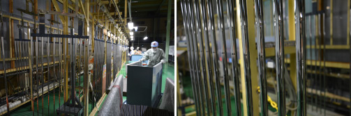 新工場内の金属ゴルフシャフト専用自動めっきライン。日本製大手メーカー製品の表面加工を手掛け、1日数万本のめっき処理が可能、国内トップシェアを誇る。ニッケル3層に、クロムめっきを加えた「4層めっき」が施され、美しい輝きを放つ。こうした多層めっきがサン工業の得意分野だ。