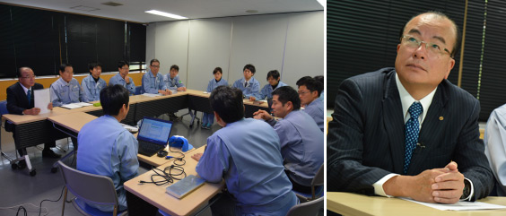 社長以下、幹部や開発担当社員15名が集まる会議室。サン工業では毎週こうした会議が行われ、開発中の表面処理技術の報告や、量産プロジェクトの進捗状況などが話し合われる。情報の共有だけでなく、社長自らが担当者に直接疑問をぶつけたり、部署を超えて問題解決にあたったりするという。
