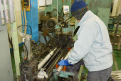 キザキの作る金属ポール製品は、まさに多種多様だ。最もポピュラーなものは野球のバットだが、変わったところでは陸上競技のやり投げで使用される「槍」も手掛けている。2m以上の長さになる槍を金属の状態から形にしていく工程は、加工や塗装など何段階もの作業を経ている。