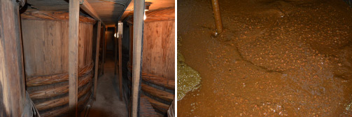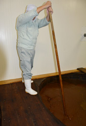 仕込み蔵に並ぶのは、明治時代に造られた七尺の杉桶。この桶に麹を入れ、塩を加えながら熟成されるまでじっくりと櫂入れをおこなう。このように天然熟成させてもろみから、マルヰ醤油が作られている。また長野県テクノ財団の協力を得て、杉桶から抗菌性を有する乳酸菌を抽出して、これを活用する研究開発も進められている。