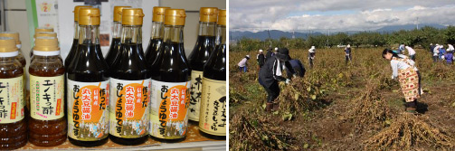 醤油づくりの麹の原料となる大豆と小麦は、ほとんどが地元信州産だ。塩も天日塩を使用するなど、原料へのこだわりに妥協はない。また昨年からは長野市内の遊休農地を利用して障害者施設の方や小学生・農業ボランティアとともに大豆の自社栽培もおこなっていて、独自のブランドとして商品化も実現した。
