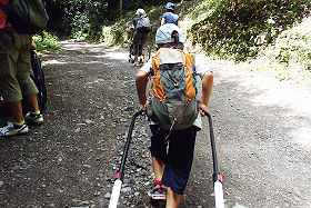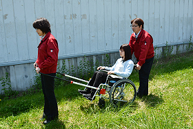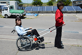 車いすを移動させる道路には砂利道もあり階段など段差があり坂道もある。こうした道路状況の中でスムーズな移動をどうしたらできるか。