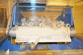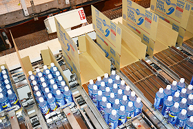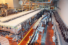 自社で成形されたPETボトルは、そのまま充填室に送られて飲料が詰められる。この一連の工程は、全てクリーンルームで行われている。また徹底した温度管理によってボトルに詰めることで、お茶や紅茶などの香りや風味が損なわれることなく製品化される。1日最大約75万本(500mlペットボトル)の飲料が、この工場で生産されている。