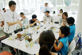 組み立てるのは、日本無線オリジナルのAMラジオ。あらかじめ回路を配線したプリント基盤に、抵抗やコンデンサなどを組み込み、はんだ付けをします。初めてはんだ付けを体験する子供たちも多いため、まずははんだ付けの練習から開始。本教室では組み立てる子供たちへのサポート役として、日本無線の社員たちも参加してはんだ付けの説明をしたり、組み立てのサポートをしたり大活躍でした。