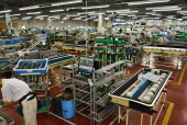 こちらの農業機械用のエアコン製造ラインは、以前手作業で組み立てていたものを自動化したもの。「必要に応じて必要な速度で」という観点から、極端なスピードアップを避けて設定されている。これによって高速ロボットによるラインの4分の1の設備投資に抑えると同時に、従来の製造ラインから加工時間を半分に短縮した。