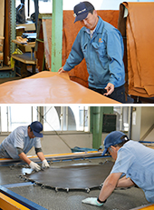 天然皮革の加工は、出荷に至るまでいくつもの工程を経て仕上げられる。なめしや乾燥・塗装・伸ばしなど、その作業は20項目を超える。工場に並ぶ加工用の大型機械の中には、海外でしか製造されていないものも数多い。品質管理や検査設備も備えているほか、環境保全への取り組みにも努めている。このような設備や規模を持つ皮革加工企業は、現在は国内で数社しかないという。