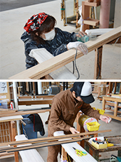 工場内では大型機械を使った木材のカットや自由設計のオーダーに応える社員の熟練作業が展開されています。