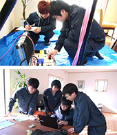 高村研究室では住宅メーカーとタイアップし、長野県北部の中野市で蓄熱システムを使った実験を進めています。床下に蓄熱システムとエアコンを設置し、蓄熱と放熱のより効率的なレイアウトを解析しています。学生たちは連日、張り巡らしたセンサーのデータを収集しています。