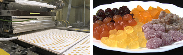 独特の食感が人気のグミ。こちらはコーンスターチの型にグミ液を流す前の様子。