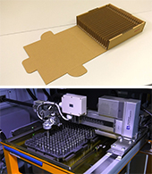 梱包用の段ボールが次々に搬送される様子が特徴的な生産ライン。梱包資材の設計製造も柱のひとつです。ユーエスアイの創業は1962年、「浦野紙器製作所」として段ボール製造から出発しました。自動化と手作業による組み立てなど、長年のノウハウを生かしながら独自の成長をたどっています。