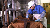 蒸し上がった大豆から放たれる大量の湯気に包まれた工場。大豆の香りが広がります。五感に頼る製法とは...『仕込み蔵に入ると静まった蔵の中では「プチン」「パチン」ともろみ達の育つ声が聞こえます。このように私たちの醤油造りは 目(みる)、耳(きく)、鼻(かぐ)、口(あじ)、手(さわる)で感じながら、「五感で醸す」ことを大切にしています。』(マルヰ醤油HPより) マルヰ醤油は職人の技を生かした製法に加え、原料の大豆も県内産にこだわっています。