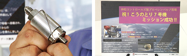 2018年11月に、国際宇宙ステーションから地球に帰還したこうのとり7号機の小型回収カプセル。 伸和コントロールズでは、無事の帰還を祈り、式典を開いたといいます。 康回収カプセルには同社製の電磁弁(バルブ)が採用されました。