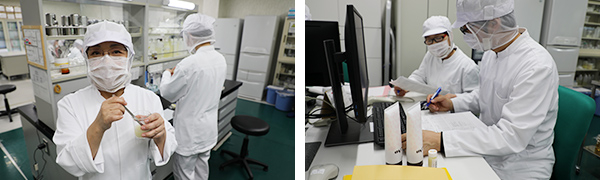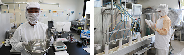 「化粧品には、数多くの原料を使用しています。お客様の髪や肌に触れる商品ですので、十分にチェックを行って作業しています」